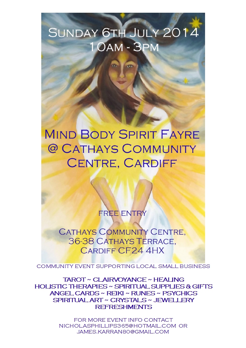 I will be holding a stall at my own Mind Body Spirit Fayre in Cardiff which will be held on Sunday 6th July at Cathays Community Centre, Cardiff. For more information about the event please see the facebook page here