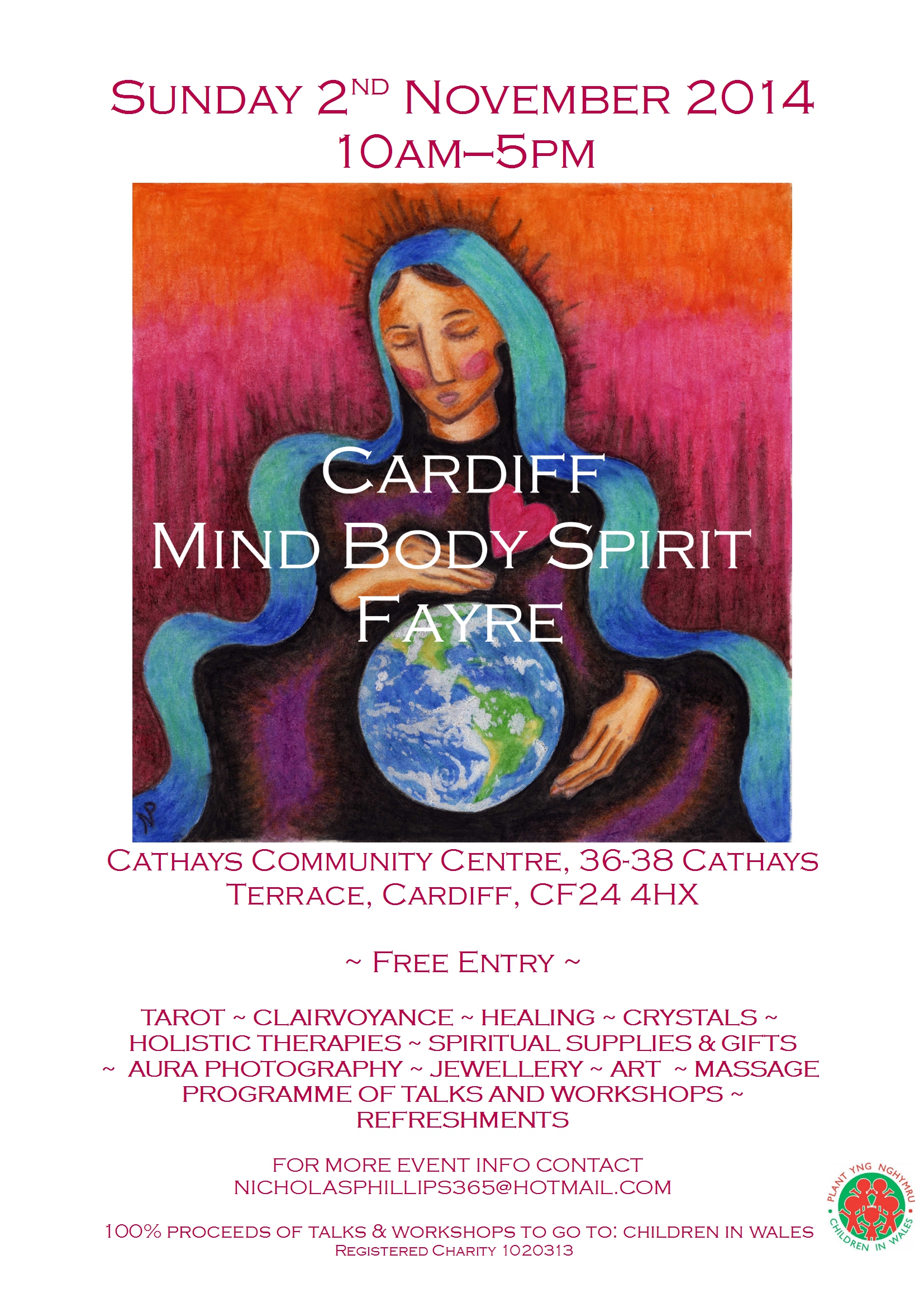 I will be holding my 2nd Mind Body Spirit Fayre in Cardiff on Sun 2nd Nov 2014 at Cathays Community Centre, Cathays Terrace, Cardiff where I will also have my own stall. More details on the facebook event page. The fayre is FREE ENTRY and will feature therapists, readers, and craftspeople as well as a full programme of talks and workshops on holistic topics charged at £2 each, 100% of which will go to the Children in Wales charity.