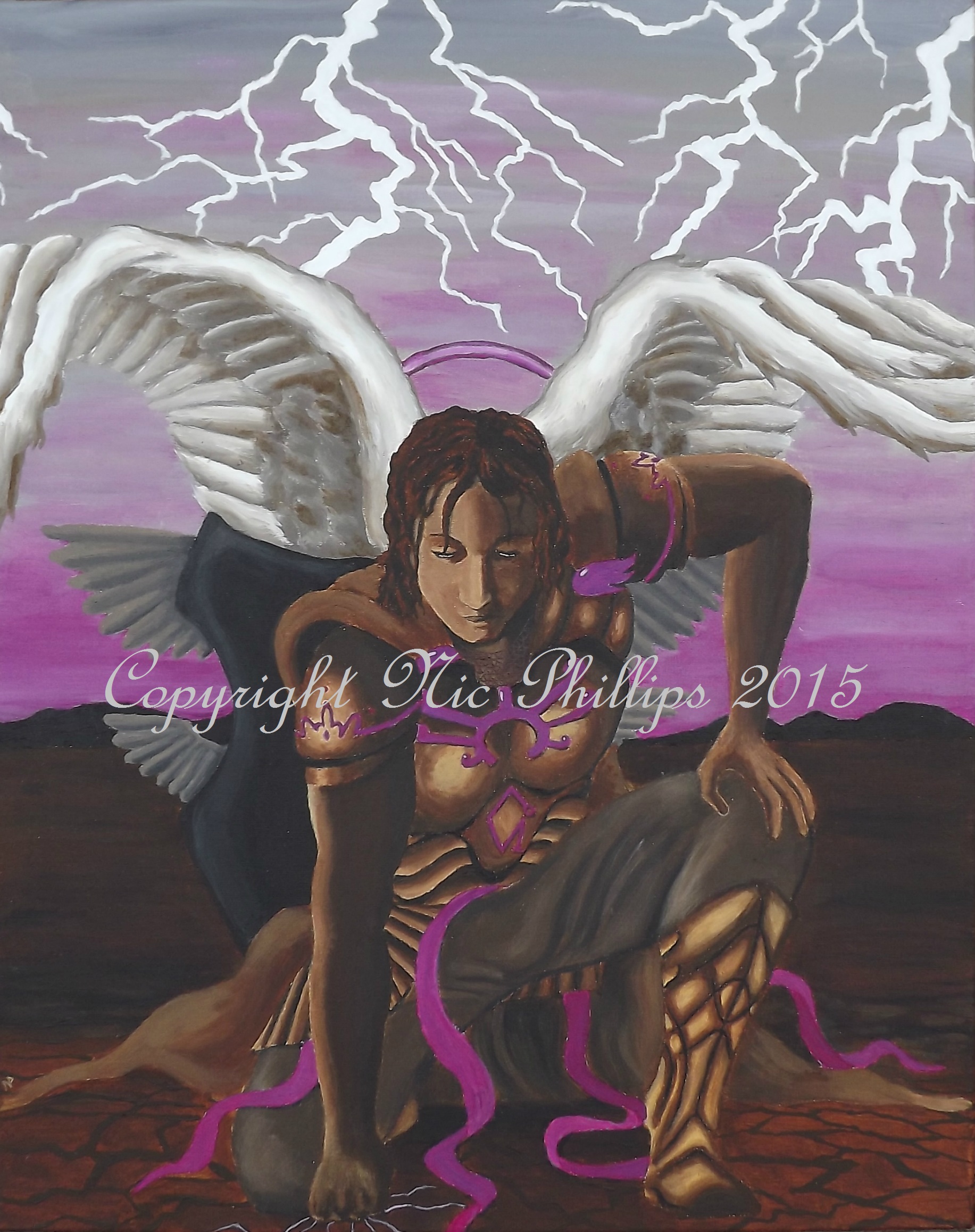 Archangel Uriel – associations: element of Earth, nature, thunder and earthquakes, Tarot suit of Shields (Pentacles) (Acrylic on canvas 15.5in x 20in).