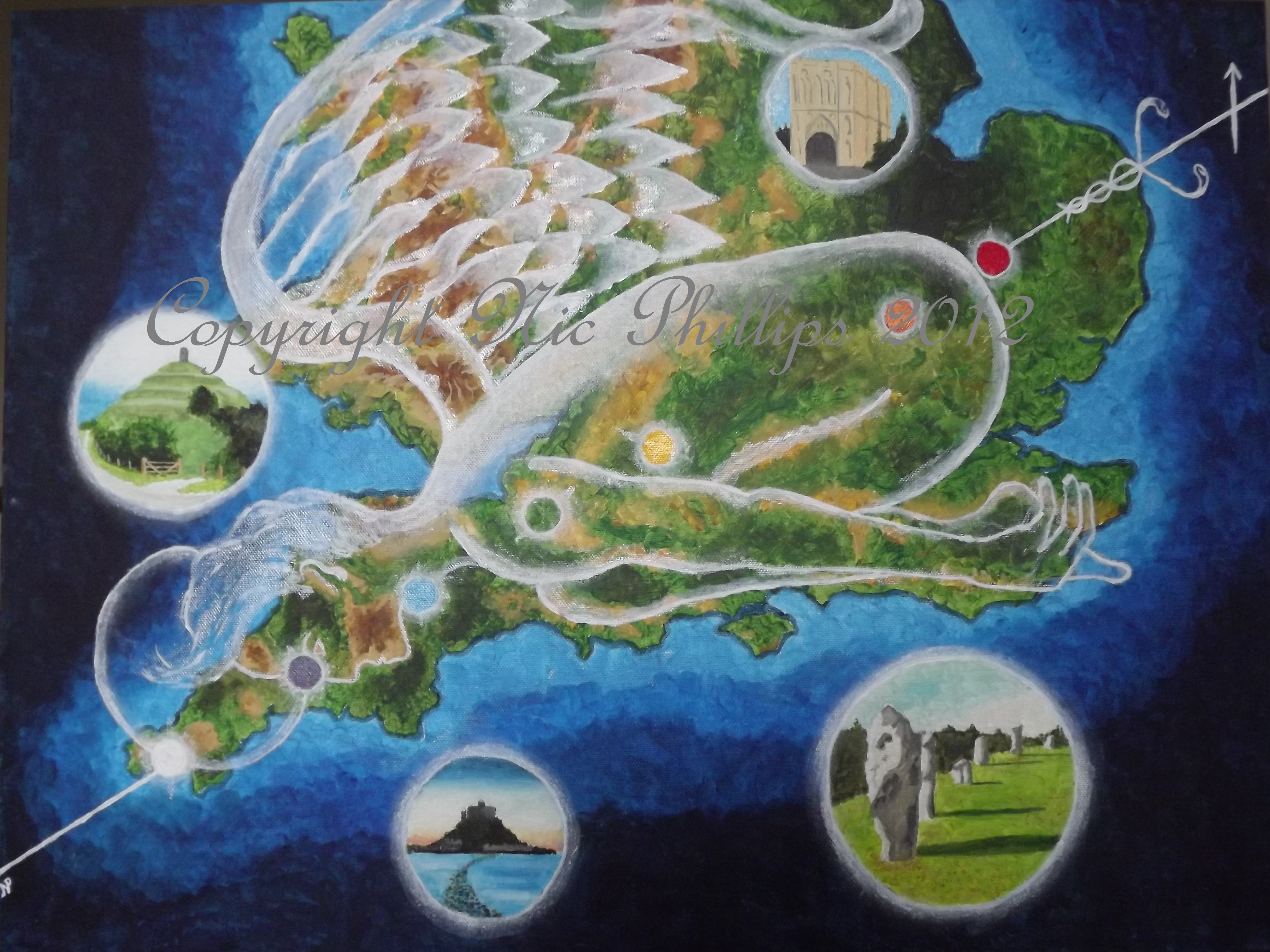This picture is inspired by a combination of interests of mine. What it essentially depicts is the legendary leyline known as the St Michael Line thought to run from the southwestern tip of Cornwall in a straight line across Southern Britain passing through a great number of sacred sites dedicated to St Michael. There are in fact two lines, commonly called ‘Michael and Mary’ which intertwine and meet at significant energy spots on the way, some of which are depicted here. I have chosen to show these locations as the axis of a chakra system of the body. In this case St Michael’s Mount in Cornwall is displayed as the crown chakra, Glastonbury is the heart, Bury St Edmunds Cathedral is the red base chakra etc. The chakra system is borrowed from Eastern mysticism as is the yogic pose the angel Michael reclines in. Acrylic on canvas (18in x 24in).