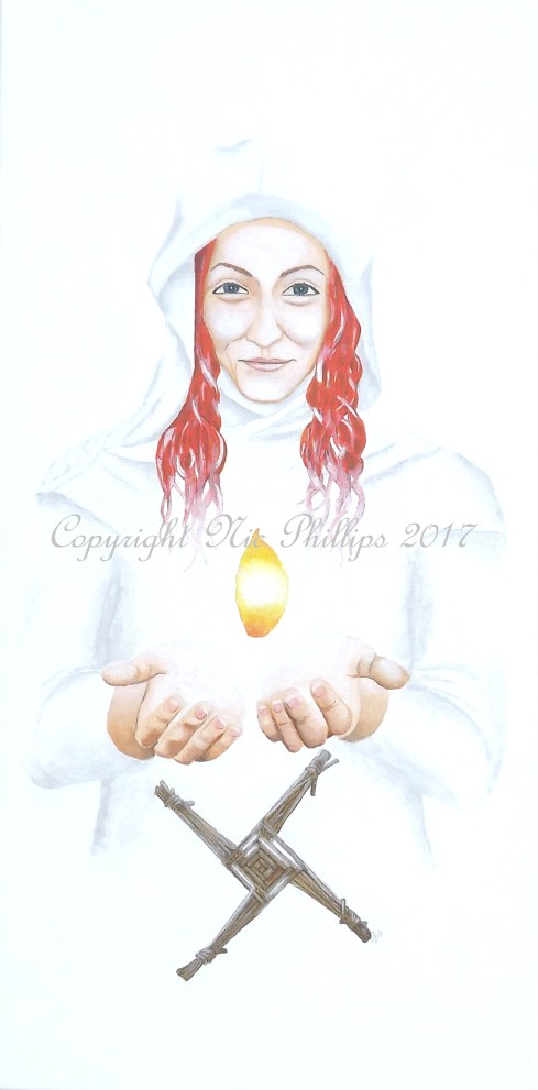 One of Ireland’s most famous goddesses who became absorbed into the ranks of its Celtic saints. Here she symbolises the returning light after the dark of Winter. (Acrylic on canvas 24in x 12in). Copyright Nic Phillips 2017