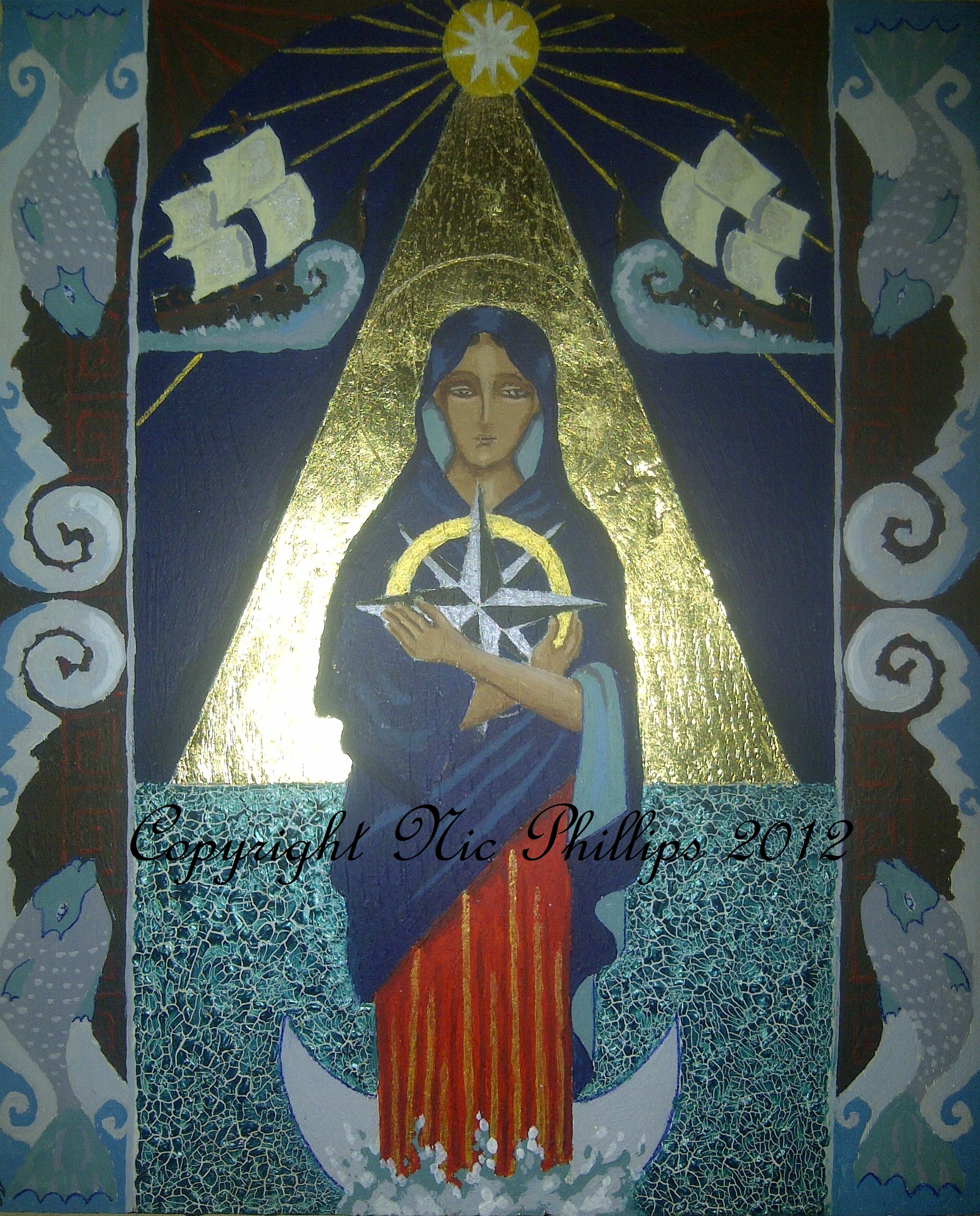 Meaning ‘Star of The Sea’, this icon depicts Mary as the moral and spiritual compass to the individual. The four fish represent the four gospels and the ship symbolises the soul’s journey. With its maritime theme, Stella Maris is a popular icon for fishermen, travellers, and seafaring traders. Acrylic, gold leaf, and cracking paint on wood (8in x 9.5in).