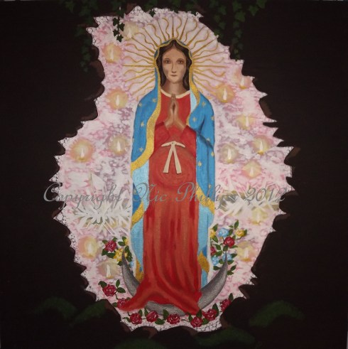 This picture of the Virgin Mary follows the style of the popular Central American version known as ‘Our Lady of Guadalupe’. It hails from a famous 16th century apparition on cloth venerated in Mexico showing the Virgin in red, with blue cloak adorned with stars, the sun’s rays at her head, and crescent moon beneath her feet. When the man to whom she appeared, Juan Diego, was asked for proof of the apparition, dozens of Castillian roses cascaded from his clothes and her image was found imprinted on his cloak. Here she is shown in a grotto setting surrounded by glittering quartz and tiny candles of devotion. Acrylic on canvas (18in x 18in).