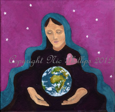 A simple New-Age style rendering of Mary as Earth Mother. Acrylic on canvas (8in x 8in).