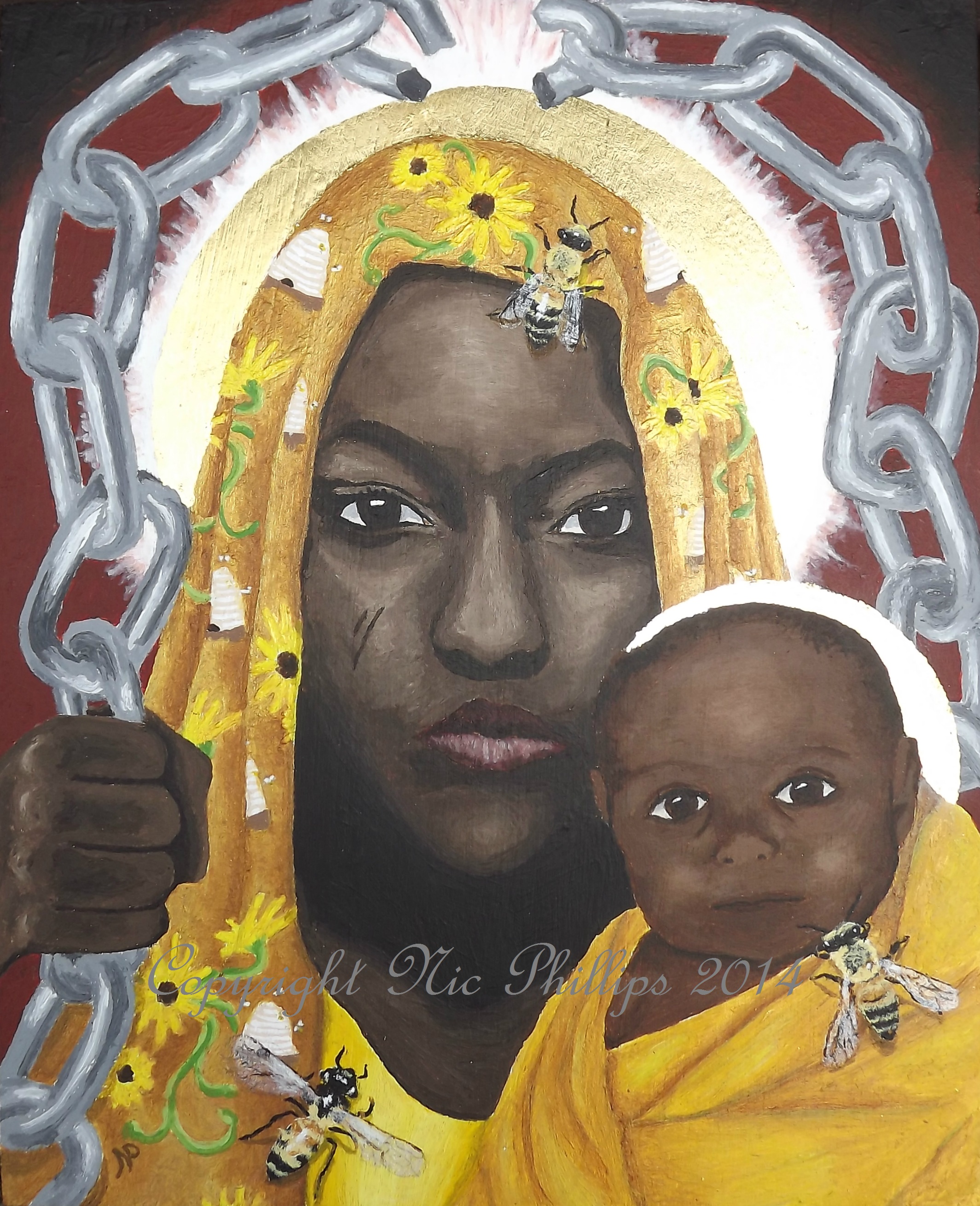 This piece was inspired by the Black Madonna and in part by the fictionalised version ‘Our Lady of Chains’ from the book ‘The Secret Life of Bees’ by Sue Monk Kidd. It also bears influence from the Haitian lwa, Mama Erzulie Dantor. I really wanted to portray a strong African-American Black Madonna after my more traditional Eastern Orthodox one and my Black Isis. And something was nagging me for ages to do a painting involving bees! Acrylic and gold leaf on wood (8in x 10in).