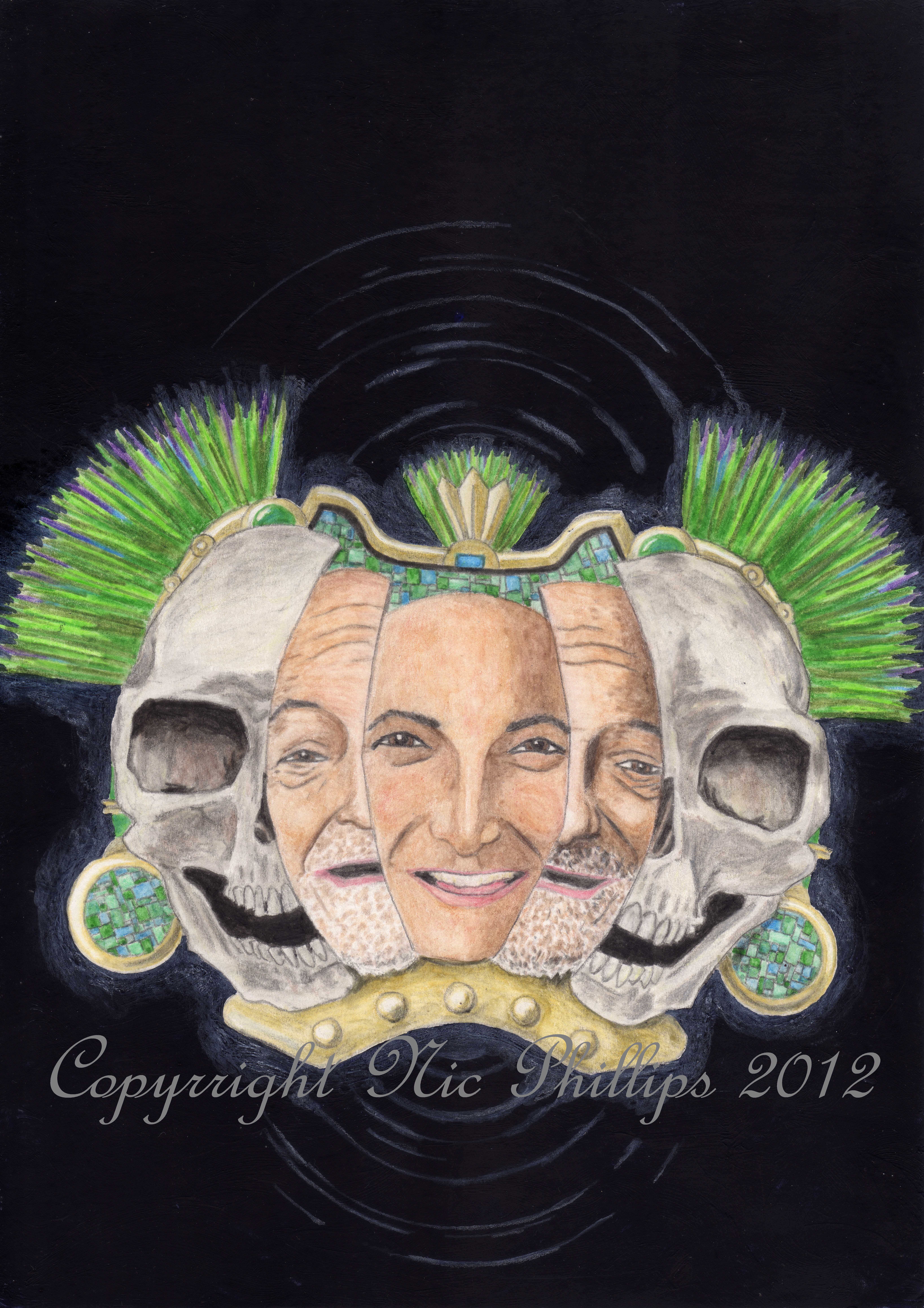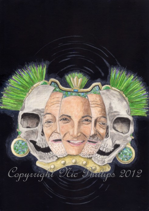 This picture is from and was designed specifically for, the anthology ‘Memento Mori’ from Avalonia Press (forthcoming). The theme of the articles and artwork in the book is, as the title suggests, about death; the title being the Latin phrase meaning “Remember you will die”. The inspiration for this picture was the Aztec mask of Death and Rebirth, a modern name for a stylised piece of pottery that features in layers the face of a young man, an older man, and finally a skull. Historians speculate that its meaning is the same as that of Memento Mori, a reminder that we all will age and die. Ink and watercolour pencil (8in x 12in).