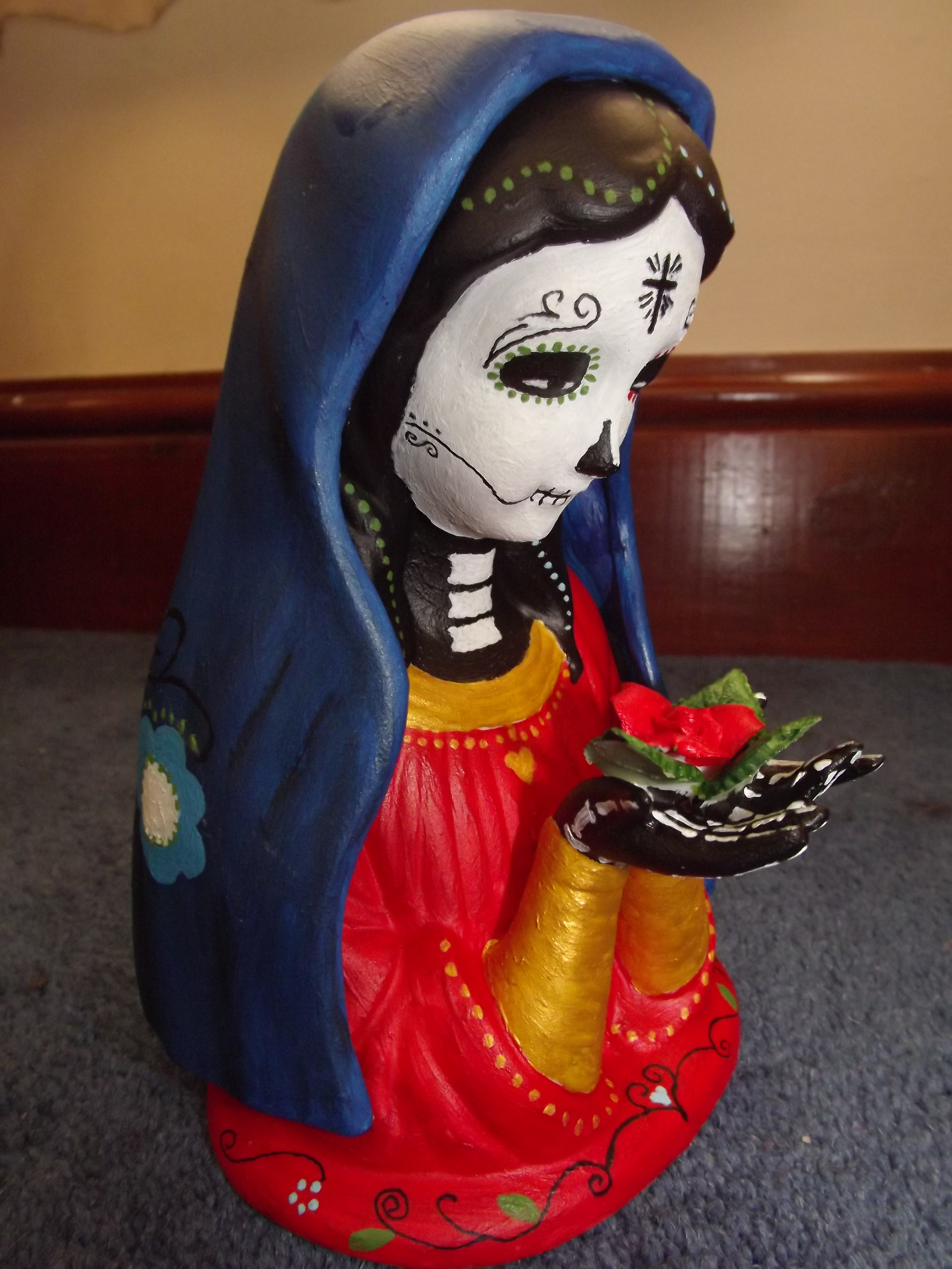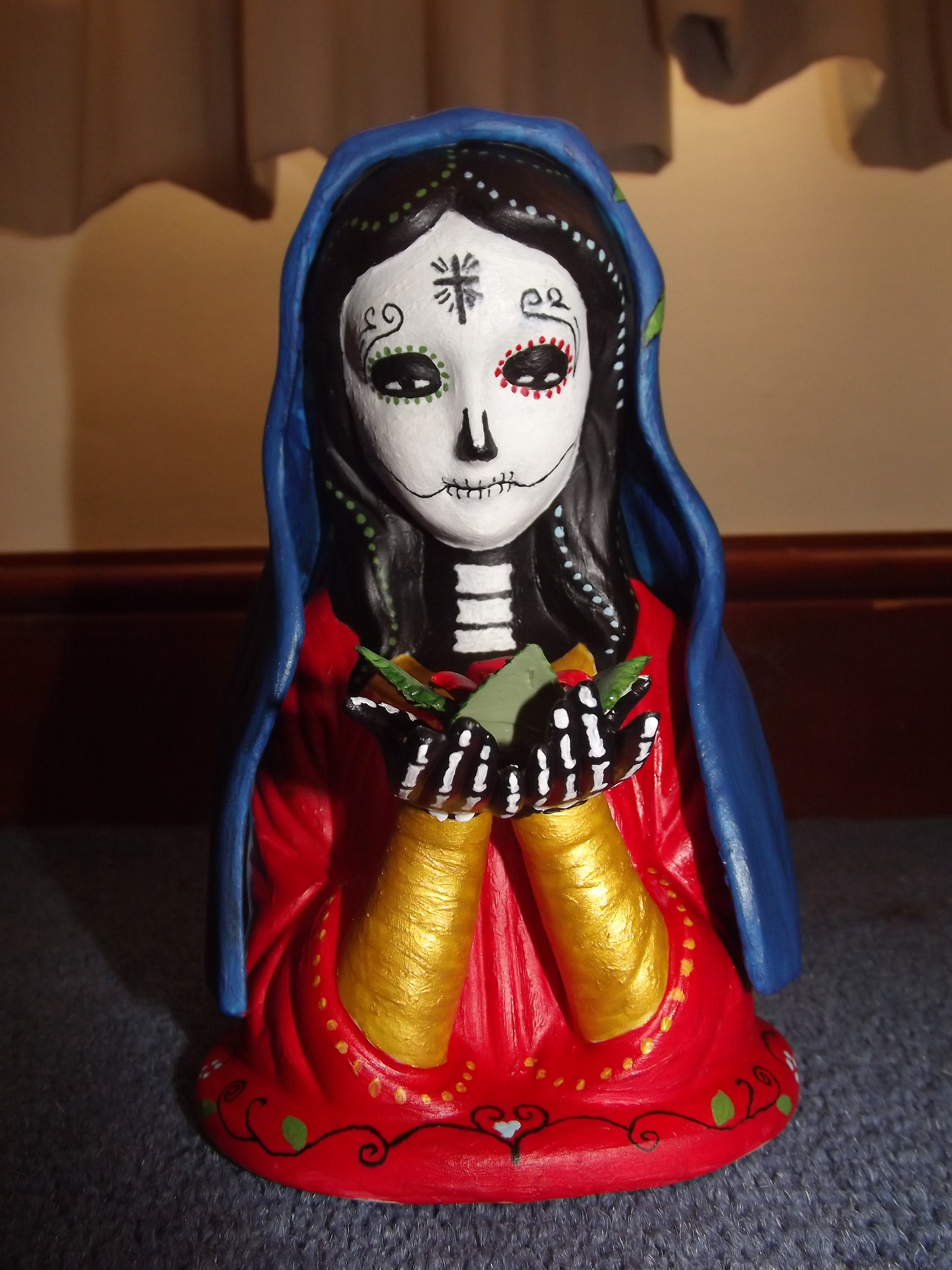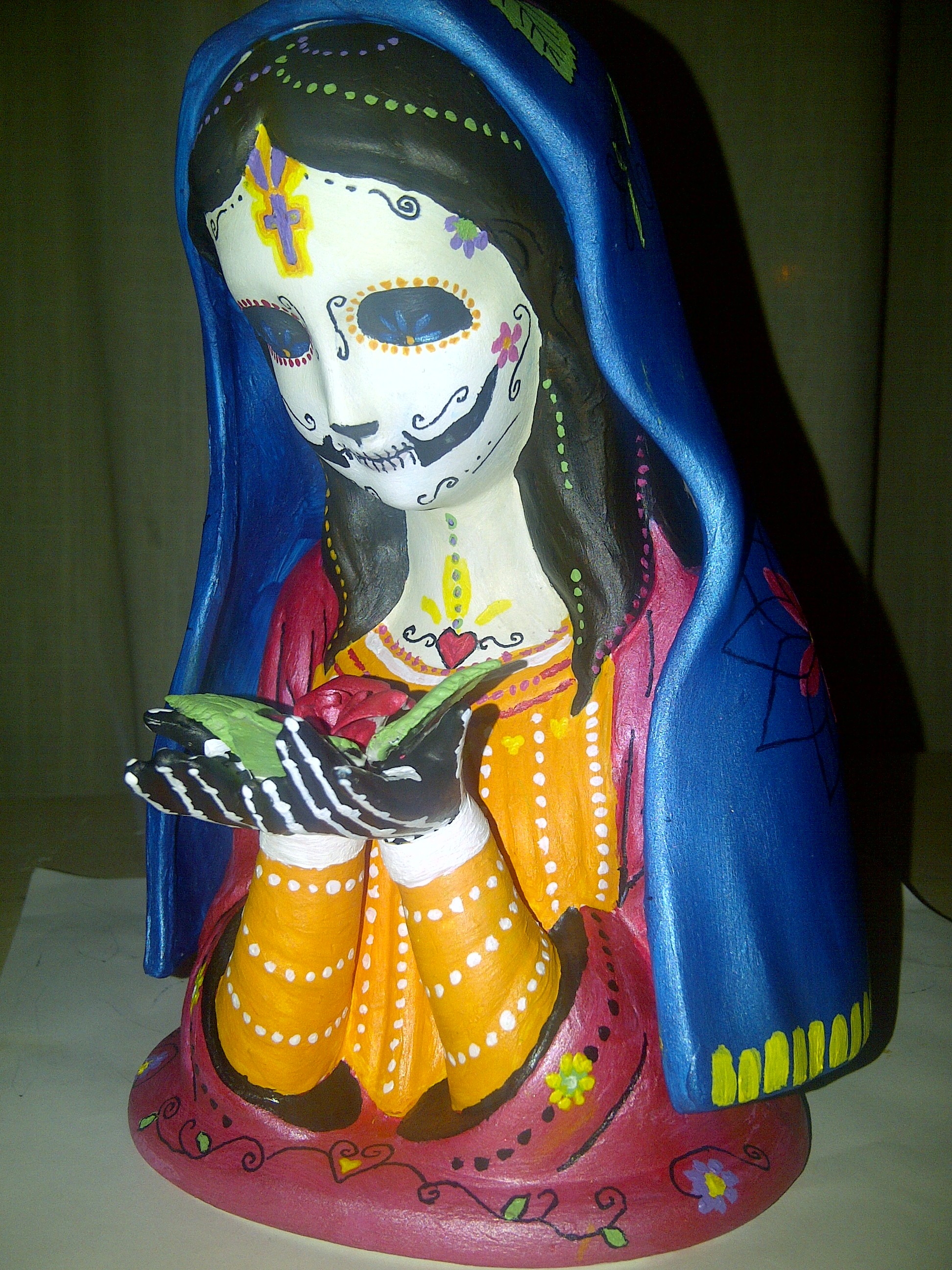 DSCF1794 DSCF1798IMG-20130106-00981‘Santa Muerte’ – One of a kind, handpainted plaster statue. Based on the Mexican Santa Muerte, literally ‘Saint Death’, and painted in the bright candy skull style with hearts, flowers and crosses.  20cm (8in) tall. Copyright Nic Phillips 2013. (Copyright only extends to painted designs, I did not mould the statues)