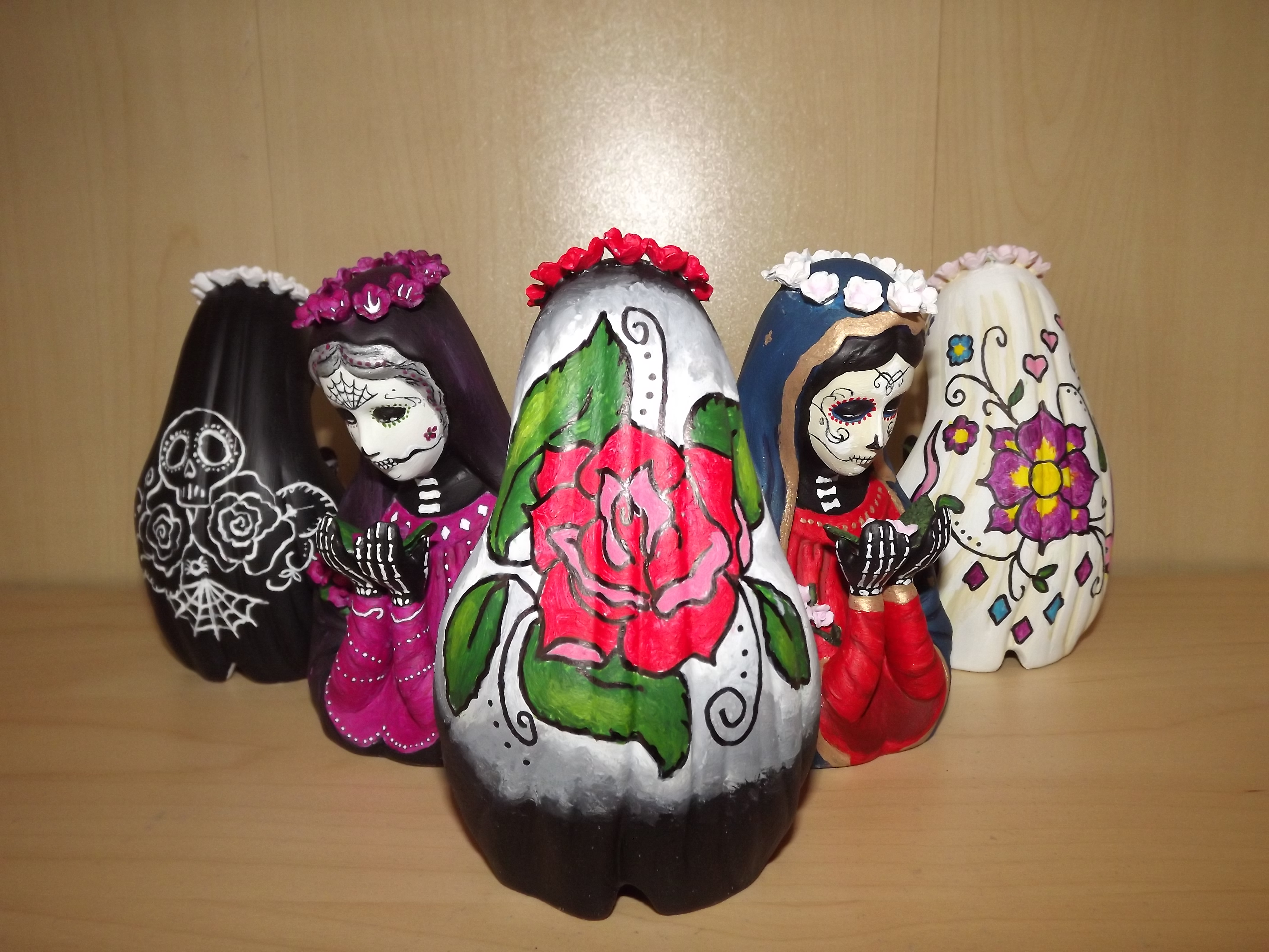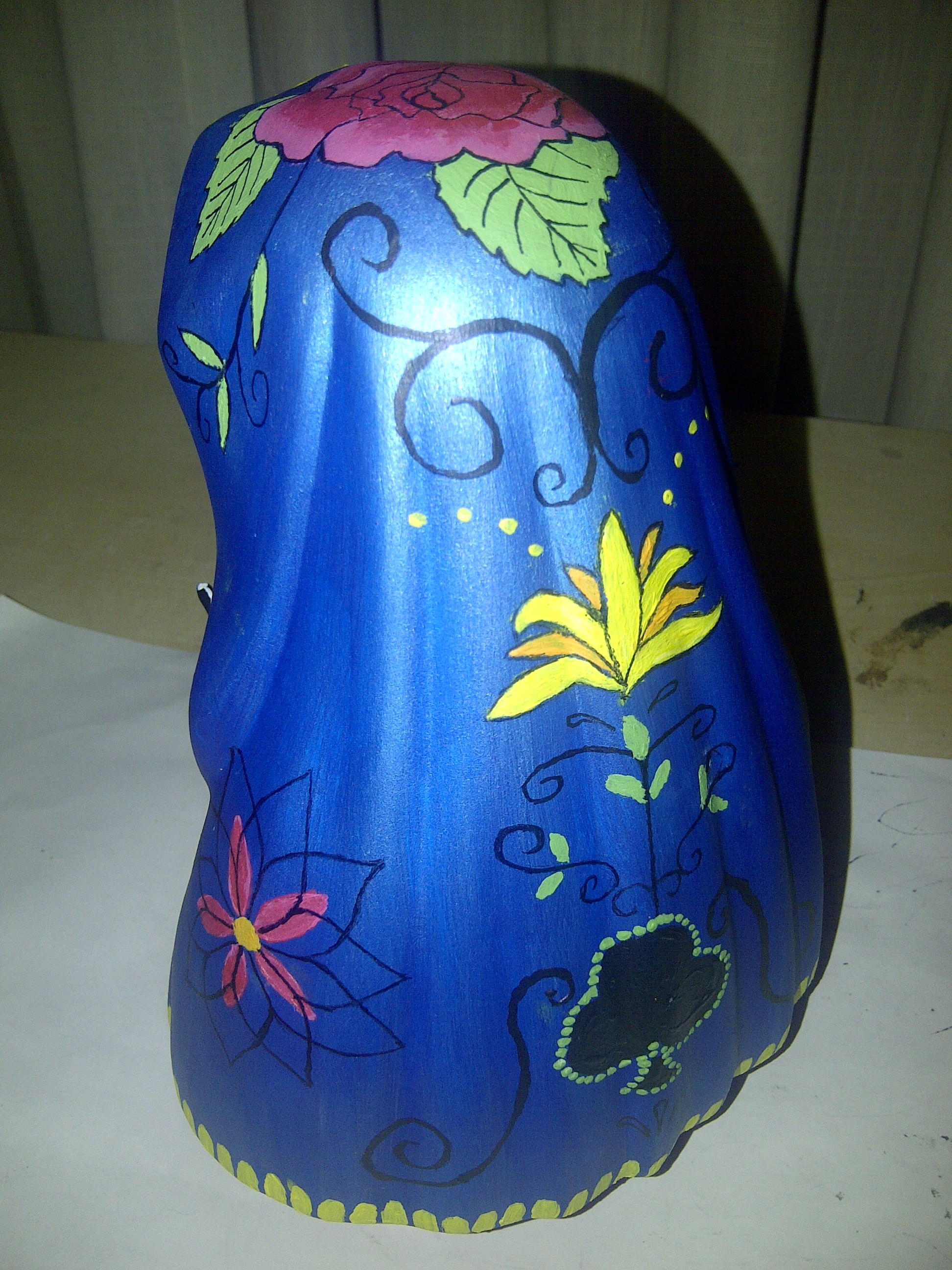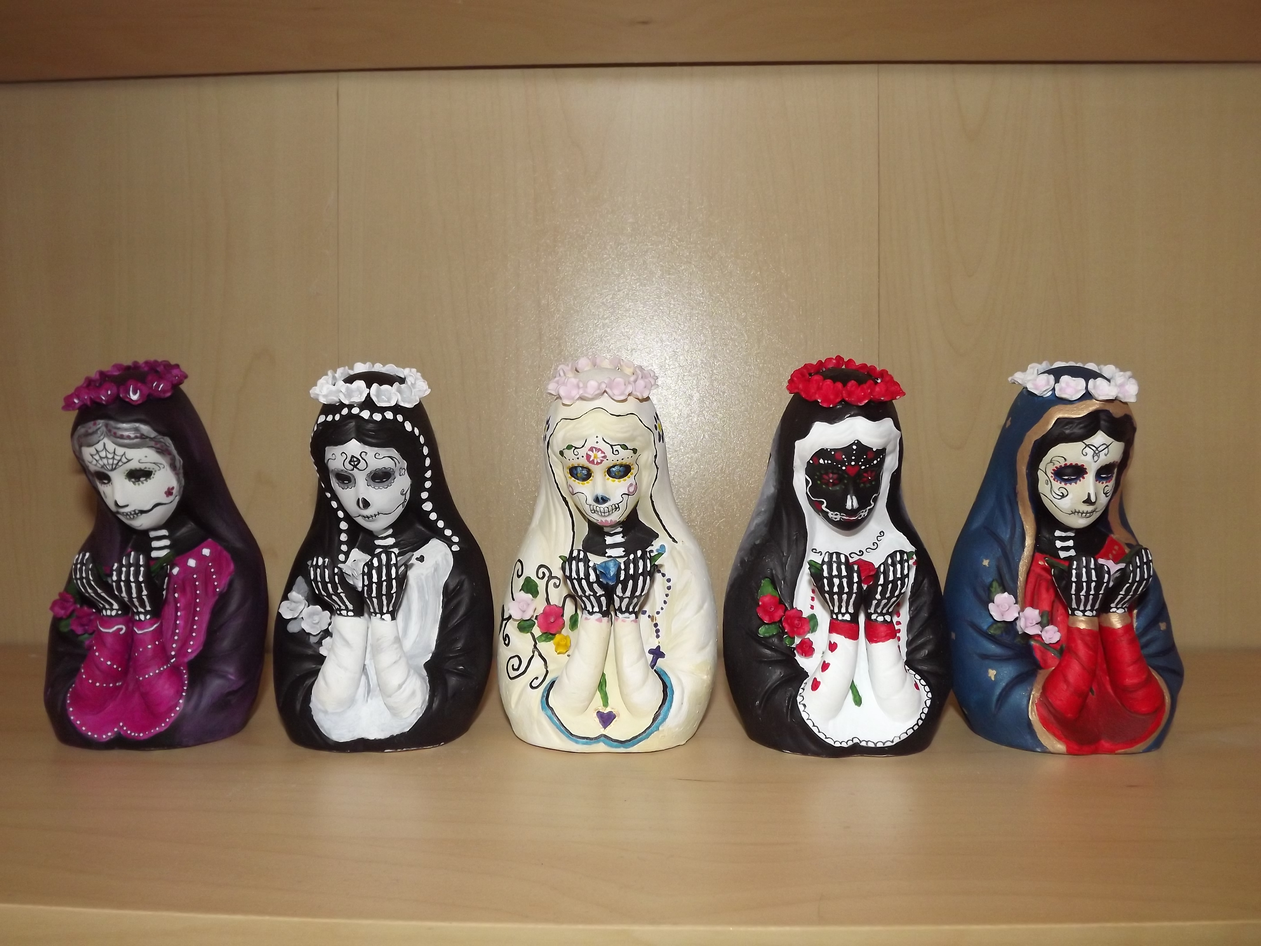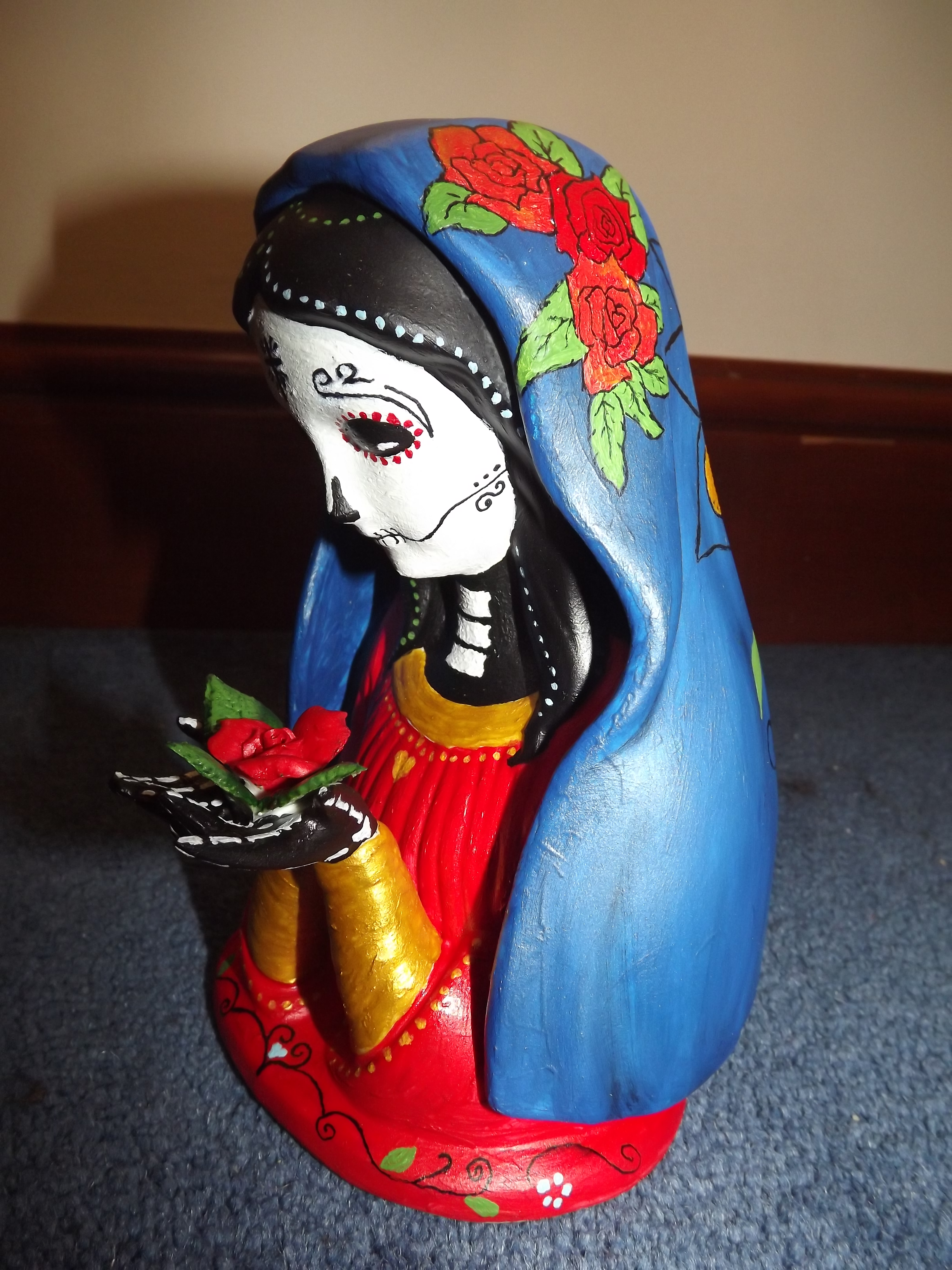 DSCF1794 DSCF1798IMG-20130106-00981‘Santa Muerte’ – One of a kind, handpainted plaster statue. Based on the Mexican Santa Muerte, literally ‘Saint Death’, and painted in the bright candy skull style with hearts, flowers and crosses.  20cm (8in) tall. Copyright Nic Phillips 2013. (Copyright only extends to painted designs, I did not mould the statues)