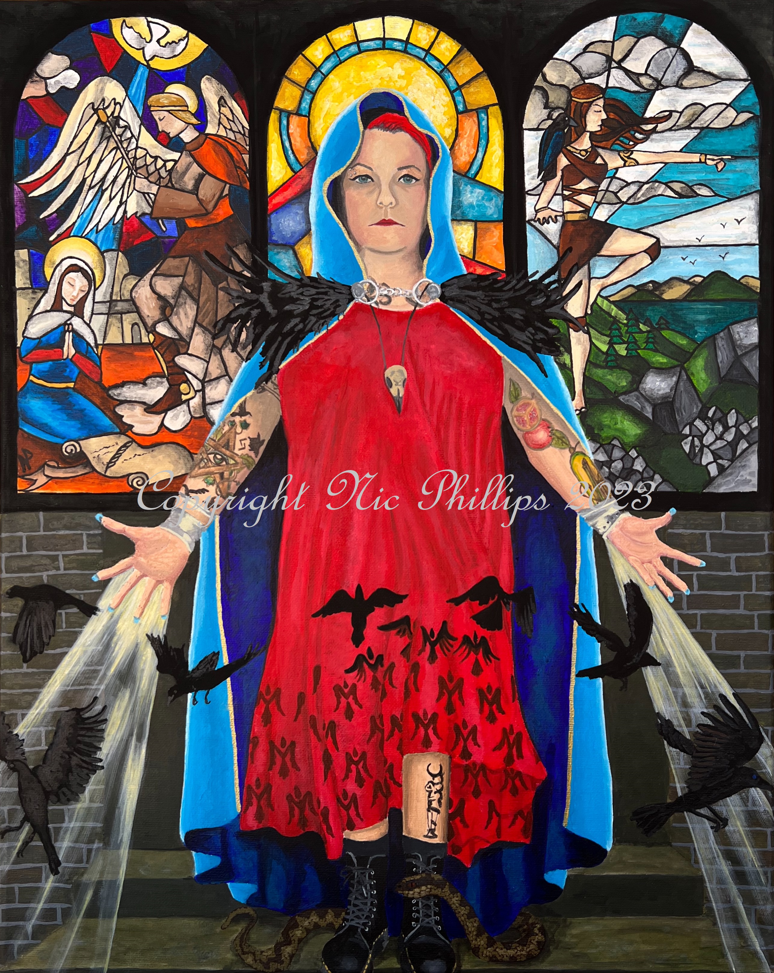 The model is herself called Crow, a witch who lives in Cornwall and runs @marget.inglis_witchcraft. She posed as a combination of the Virgin Mary and the crow goddess The Morrigan, who we see in the stained glass either side and which reflect parts of Crow’s story. Crow in her own words said:
