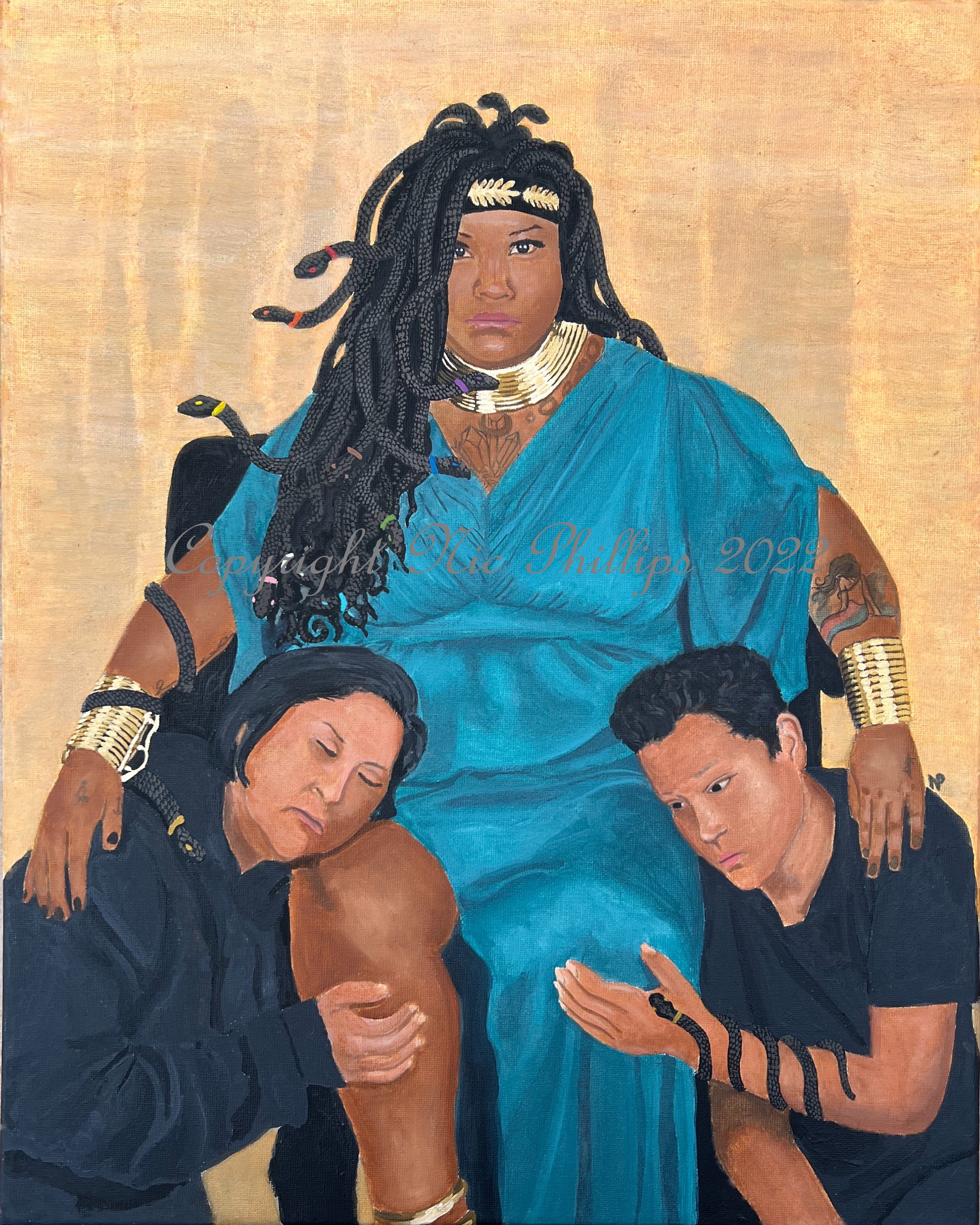 Medusa is a goddess of protection and empowerment. And my work with her has been deeply healing and transformative, allowing me the strength to pick up my broken pieces after I was sexually assaulted in 2016. While there are many myths and stories surrounding Medusa, I love the depiction of her as a black goddess with locks of serpents, awarded the power to stand as a protector for ALL (not just women) who have been violated. She brings deep truths, a fierce strength, and hope in the face of some of our hardest times.