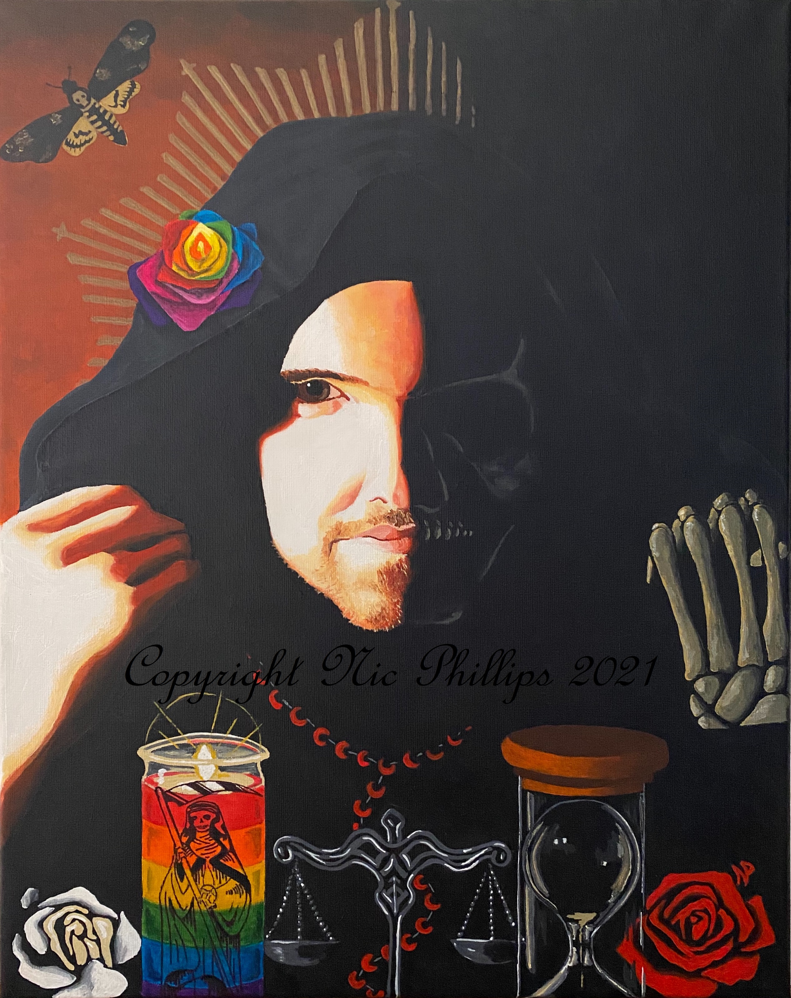The second in my Queering Deities series, this is ‘Queering Santa Muerte’. (Copyright Nic Phillips 2021).