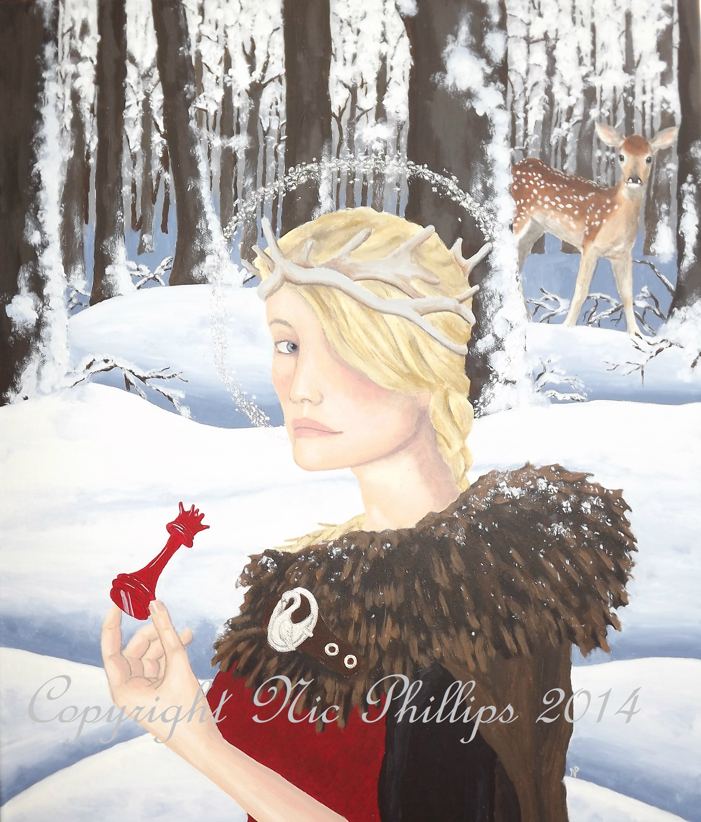 The mysterious sovereign Goddess of the British Isles, Elen of the Ways, who crosses paths with Saint Elen of Caernarvon, ‘Elen of the Hosts’ in the Mabinogion. Queen Elen ordered the construction of major castles and Caernarvon, Carmarthen, and Caerleon, and roads across Wales linking the sites. The Goddess Elen of the Ways has been linked to the leylines of Britain and the ancient migratory pathways of deer. She is especially associated with reindeer and also swans, and the constellation Cygnus. Acrylic on canvas (20in x 24 in) Copyright Nic Phillips Sacred Art 2014